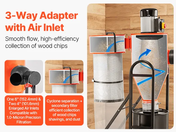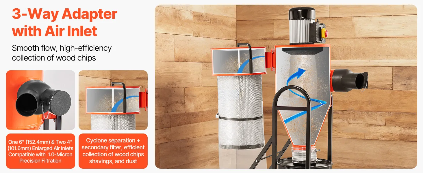 Unser Staubabsaugsystem verfügt über ein konisches Dreifach-Anschlussdesign, das den Luftstrom verbessert und Verstopfungen durch Schmutzablagerungen reduziert. Es fängt effizient Feinstaub aus der Luft ein, hält Ihre Holzwerkstatt sauberer und sorgt für einen reibungslosen, unterbrechungsfreien Betrieb.