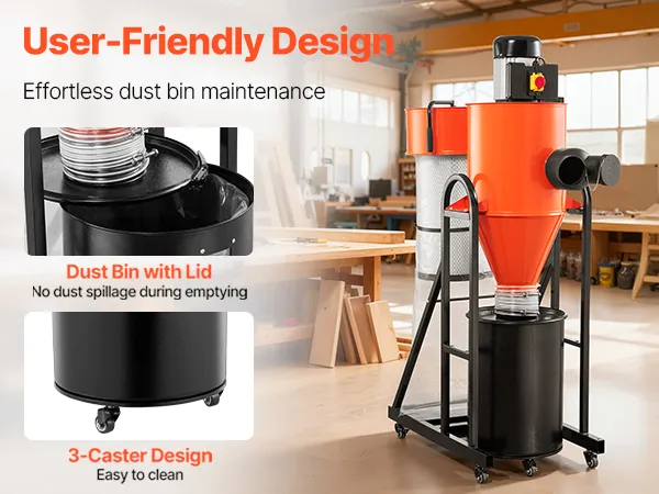 Großraumbehälter: Ausgestattet mit einem 47-Liter-Behälter fasst unser Bohrstaubsammler mehr Sägemehl und Abfälle auf einmal. Er minimiert Unterbrechungen bei kontinuierlichen Holzbearbeitungsvorgängen, ermöglicht einen reibungsloseren Arbeitsablauf und spart Aufwand bei der Bearbeitung mehrerer Aufgaben in einer geschäftigen Werkstatt.