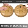 Diese Zungentrommel aus Stahl-Titan-Legierung wird von professionellen Handwerkern handgefertigt. Obwohl es einfach aufgebaut ist, ist der Klang sehr angenehm und es ist eine Art Klang wie Buddhas Töne. Es hat insgesamt elf Klänge in D-Melodie. Dies erleichtert das Lernen und bietet eine größere Auswahl an Klängen. Selbst Anfänger können leicht wunderbare Musik beherrschen und spielen. Es ist sehr gut für die Musikausbildung von Kindern geeignet, damit er problemlos spielen kann und sich nicht langweilig fühlt. Gleichzeitig wird es, da seine Stimme sehr ätherisch ist, auch in der spirituellen Heilung und Yoga-Meditation verwendet und ist sehr hilfreich, um die Emotionen der Menschen zu beruhigen.