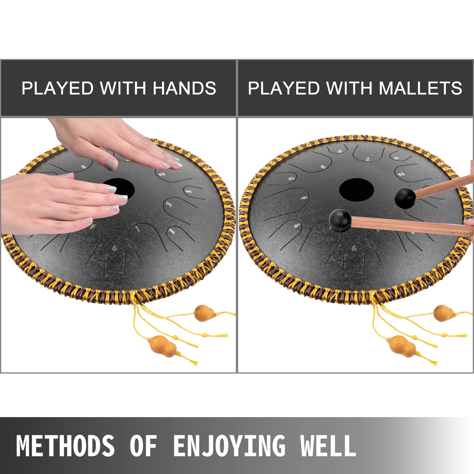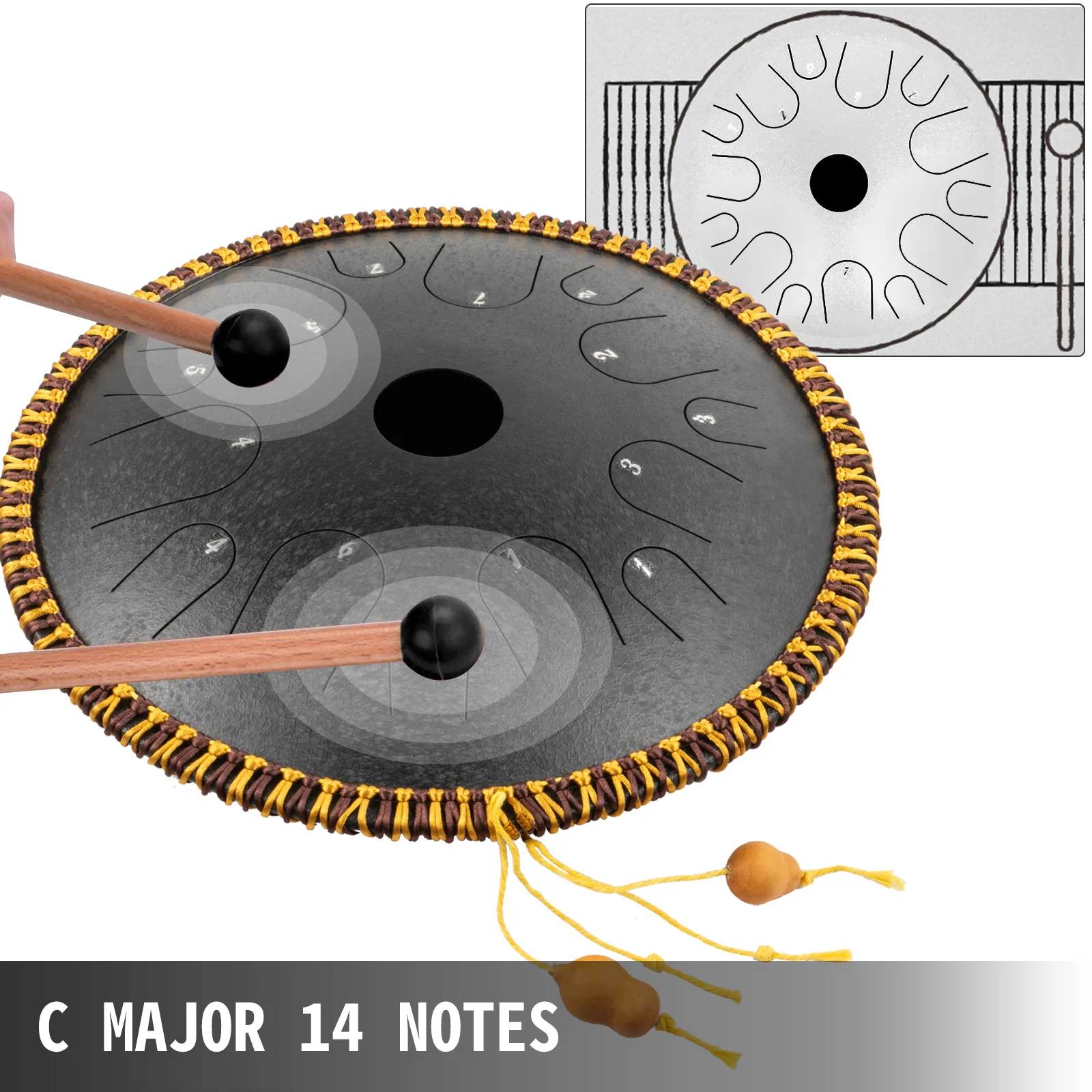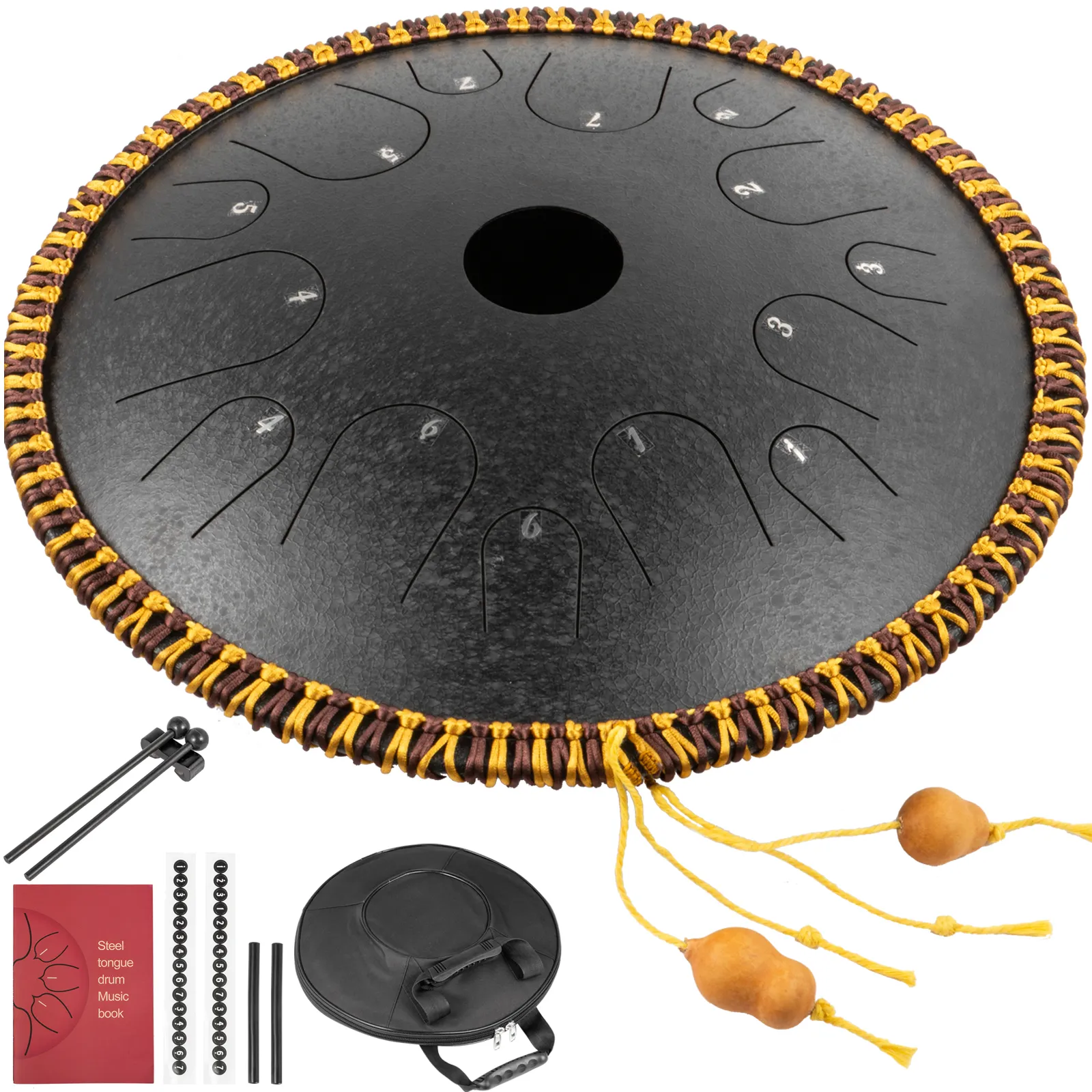 Unsere Zungentrommel aus C-Dur-Stahl wird von professionellen Handwerkern handgefertigt. Mit insgesamt 14 Tönen, bestehend aus pentatonischen Skalen, die mit zahlreichen Partituren versehen sind, können auch Anfänger entsprechend der Partitur äußerst angenehme Musik spielen.