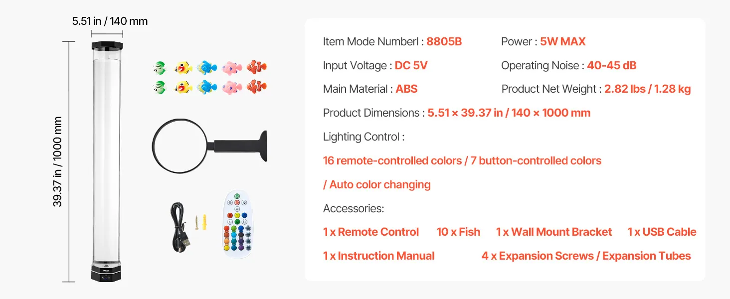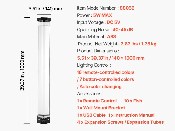 Kippschutz: Mit einer Höhe von 100 cm ist diese Wasserblasenleuchte ideal, um eine warme Atmosphäre zu schaffen. Die verbreiterten Wände der Röhre verhindern eine Verformung der Fische.