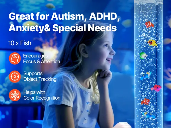 Unsere sensorische Blasenlampe ist ideal zum Abbau von Alltagsstress und trägt dazu bei, eine ruhige und entspannende Atmosphäre zu schaffen, die Ihre Stimmung verbessert.
