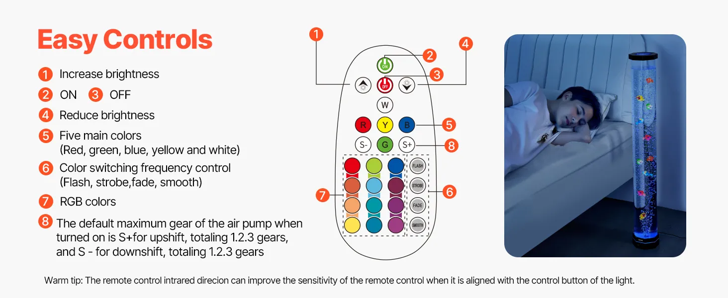 16-Farben-Beleuchtung: Steuern Sie 16 leuchtende Farben mit der Fernbedienung oder 7 Farboptionen mit den integrierten Tasten. Die Seifenblasenfisch-Lampe verfügt über automatische Farbwechsel.