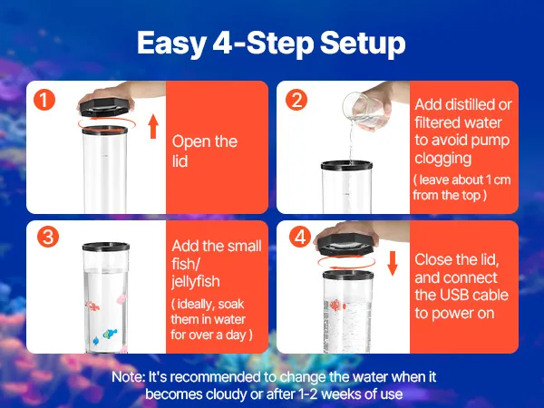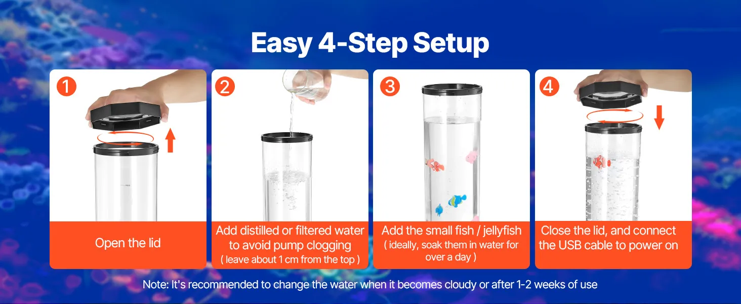 Dank der einfachen Installation in 4 Schritten können Sie Ihre neue Bubble-Tube-Leuchte im Handumdrehen genießen!