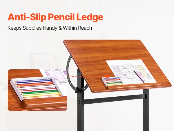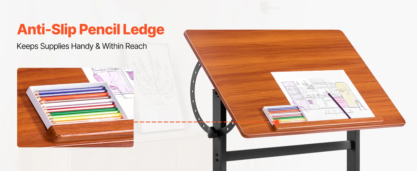 Dank des integrierten Stifthalters an den Rändern haben Bleistifte, Radiergummis und andere Zeichenutensilien immer einen festen Platz. Selbst auf schrägen Oberflächen rutschen Ihre Werkzeuge nicht ab.