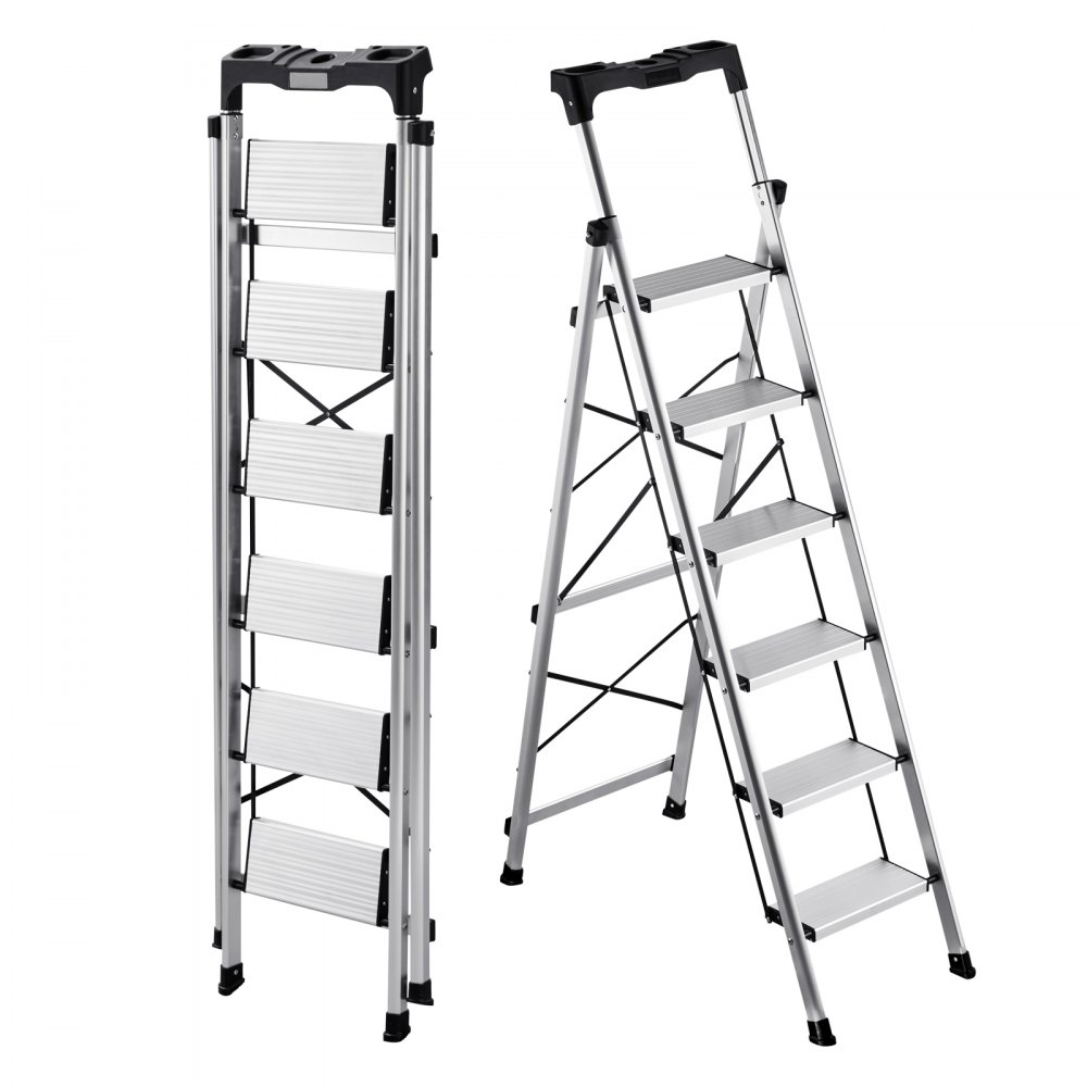 VEVOR Trittleiter 6 Stufen, Klappleiter mit Anti-Rutsch-Stufen & Komfortablem Handgriff, Haushaltsleiter Tragkraft 150 kg, Aluminium-Sicherheitsleiter für Küche, Lager, Haushalt & Büro, Silber