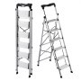 • Praktische Werkzeugablage: Die Sicherheitsleiter verfügt über eine praktische und ausziehbare Ablage für Ihre Werkzeuge, Farbeimer und andere Utensilien. So sparen Sie Zeit und reduzieren die Auf- und Abstiegszeiten, was die Effizienz steigert und Ihnen Zeit spart. Ideal zum Reinigen oder Streichen