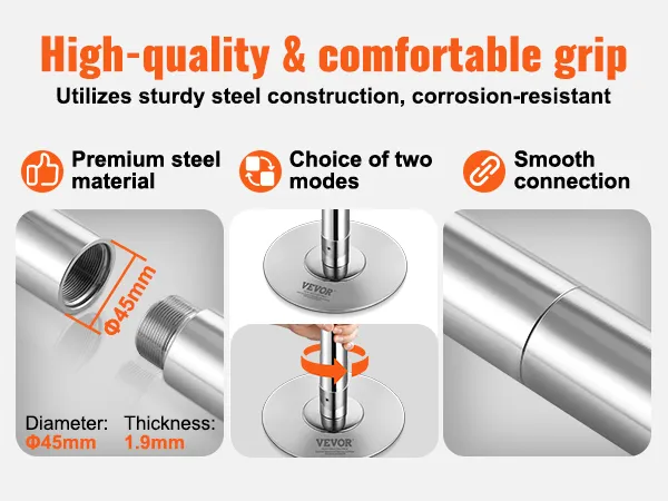 Langlebiges Material: Die professionelle Tanzstange ist sorgfältig aus einer standardmäßigen 45-mm-Stahlstange mit einer Dicke von 1,9 mm gefertigt und bietet zuverlässige Sicherheit und Robustheit. Maximale Gewichtskapazität: 200 kg / 441 lbs. Sie verfügt über eine Pulverbeschichtung für Rost- und Korrosionsbeständigkeit und verbessert die Griffstärke. Abmessungen zusammengebaut: 108,3 x 15,4 x 15,4 Zoll / 2750 x 390 x 390 mm.