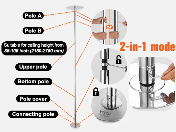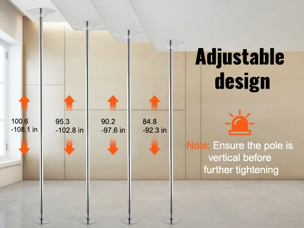 Einfach zu installieren: Die robuste Tanzstange umfasst eine Standard-Tanzstange und Verlängerungsstangen, um eine einfache Montage zu gewährleisten. So können Sie die Stange je nach Deckenhöhe auf die gewünschte Länge einstellen. Die Stange lässt sich einfach aufstellen und abbauen, benötigt keine Deckenhalterung und wird mit einer Installationsanleitung geliefert, die eine flexible Höheneinstellung ermöglicht: 85-106 Zoll (2163-2700 mm).
