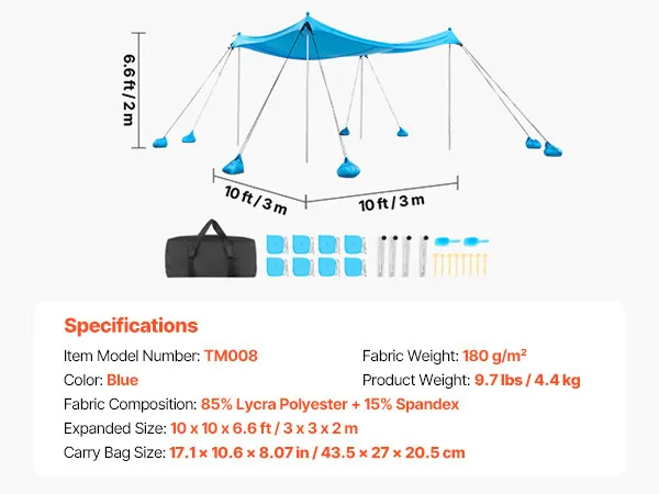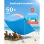 VEVOR Strandzelt mit Sonnenschutz (UPF 50+) 3 x 3 x 2 m, Strandmuschel mit 8 Sandsäcken & Stabilisierungsstangen & Sandschaufeln, Tragbares Sonnensegel für Familienausflüge Camping Angeln Blau