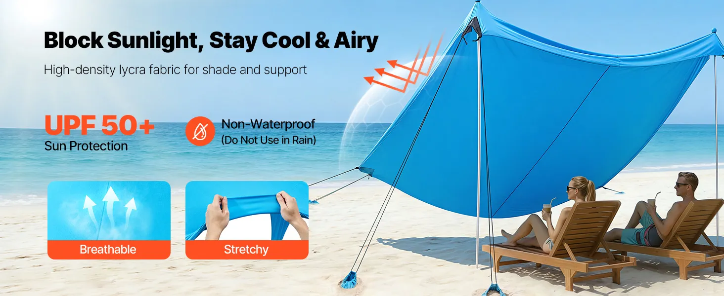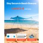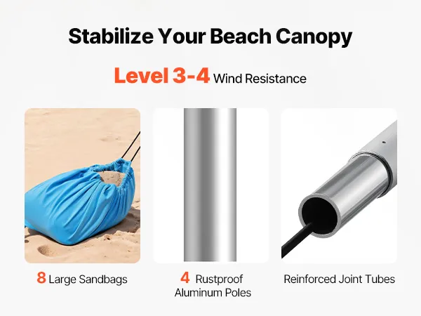 Windbeständigkeit Stufe 3–4: Unser Strandsonnensegel hält den üblichen Küstenbrisen stand, ohne umzukippen. Es verfügt über 8 große Sandsäcke, 4 verstärkte Aluminium-Stützstangen und sichere elastische Kordeln, die die Stangen für zusätzliche Stabilität fest zusammenbinden
