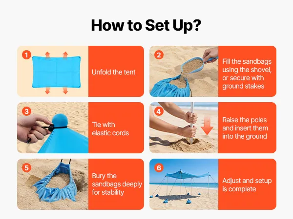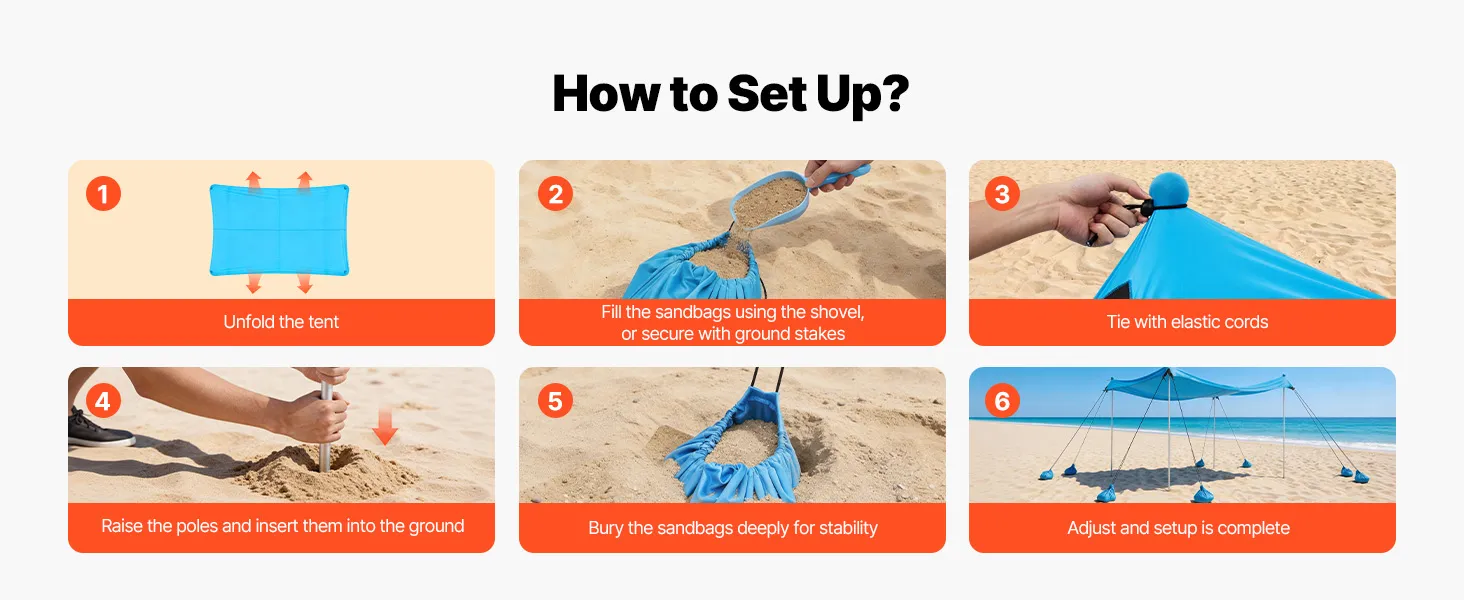 Für jedes Gelände geeignet: Dank der Verankerungsmöglichkeit mit Sandsäcken oder Heringen lässt sich dieses Strandsonnenzelt sicher auf Sand, Gras und anderen Untergründen aufstellen. Die Sandsäcke oder Stangen können einfach neu positioniert werden, um den Schattenwinkel je nach Sonnenstand anzupassen
