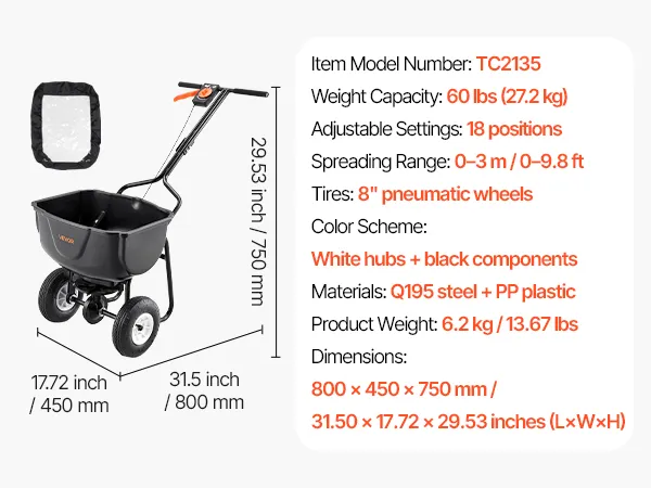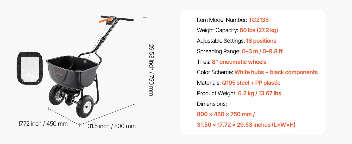 VEVOR Streuwagen, 27,2 kg, Düngerstreuer, 0-3 m Streubreite, Schleuderstreuer mit 20,3 cm Lufträdern, Saatgutstreuer, Schleuderstreuwagen für Saatgut, Gartenarbeit, Rasen