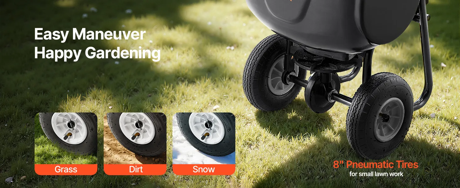 Robuste Konstruktion: Mit einem pulverbeschichteten Stahlrahmen und einem explosionsgeschützten Kunststoffbehälter ist dieser Grassamenstreuer UV-beständig und stoßfest. Ausgestattet mit 8-Zoll-Reifen für den Einsatz im Gelände