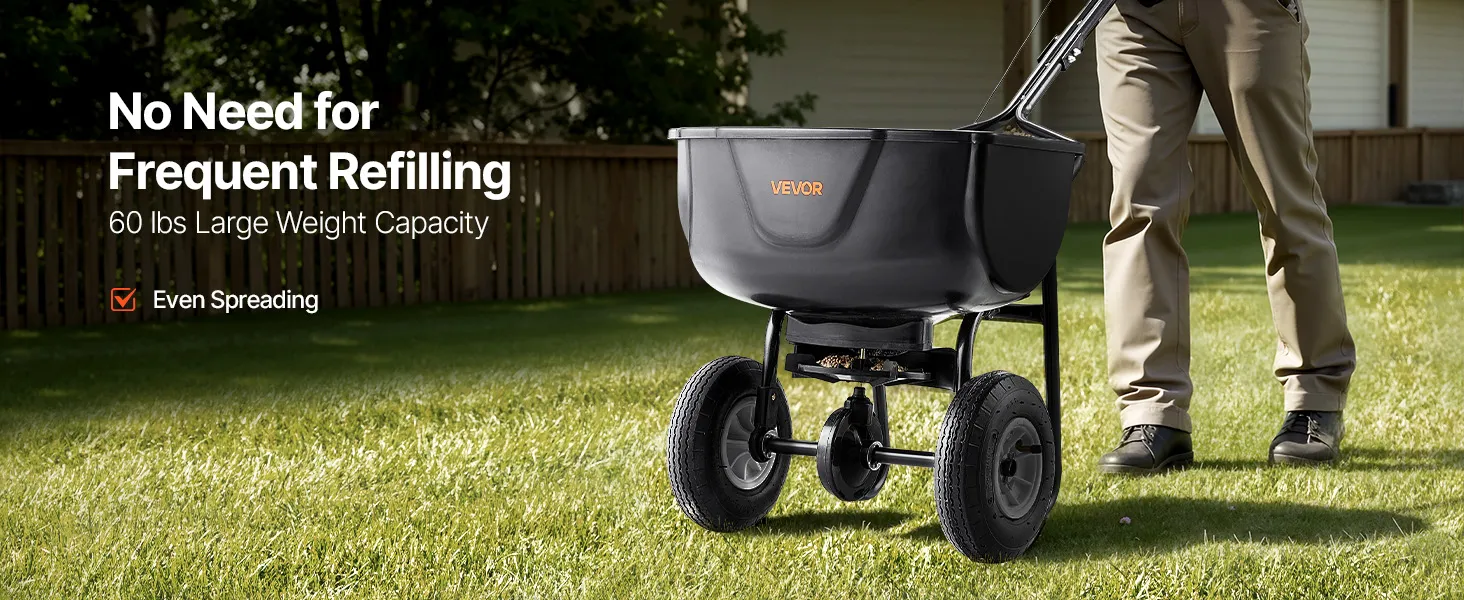 Dieser Streuer verfügt über 8-Zoll-Luftreifen und eine Streugenauigkeit von 0–3 m (0–10 Fuß). Er hat einen korrosionsbeständigen Stahlrahmen in Militärqualität. Er ist in nur 5 Minuten einsatzbereit und bietet das ganze Jahr über eine Abdeckung mit Saatgut, Dünger und Enteisung. So sparen Sie Zeit und Mühe und sorgen für einen professionell aussehenden Rasen!