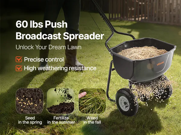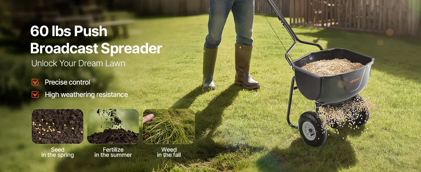Ganzjährige Vielseitigkeit: Unser Gartensamenstreuer ist ideal für die Aussaat im Frühjahr und die Düngung im Sommer und ersetzt vier Werkzeuge durch eines. Geeignet für Hausrasen und kleine landwirtschaftliche Betriebe.