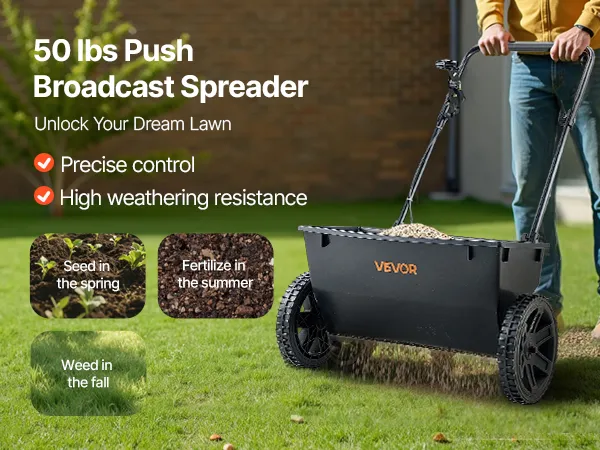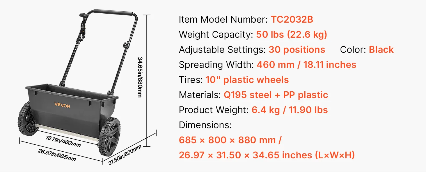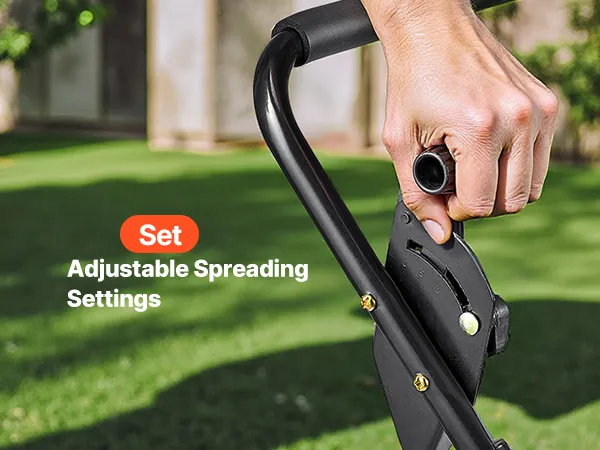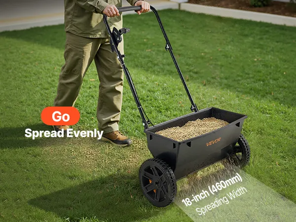 Mit 10-Zoll (25,4 cm) Reifen und 18-Zoll-Präzisionsstreuung ist der Stahlrahmen in Militärqualität korrosionsbeständig. Die Montage der Räder dauert nur 5 Minuten und bietet ganzjährige Abdeckung für Saatgut, Dünger und Eisschmelze. Sparen Sie Zeit und Mühe und gestalten Sie Ihren Rasen in Profiqualität!
