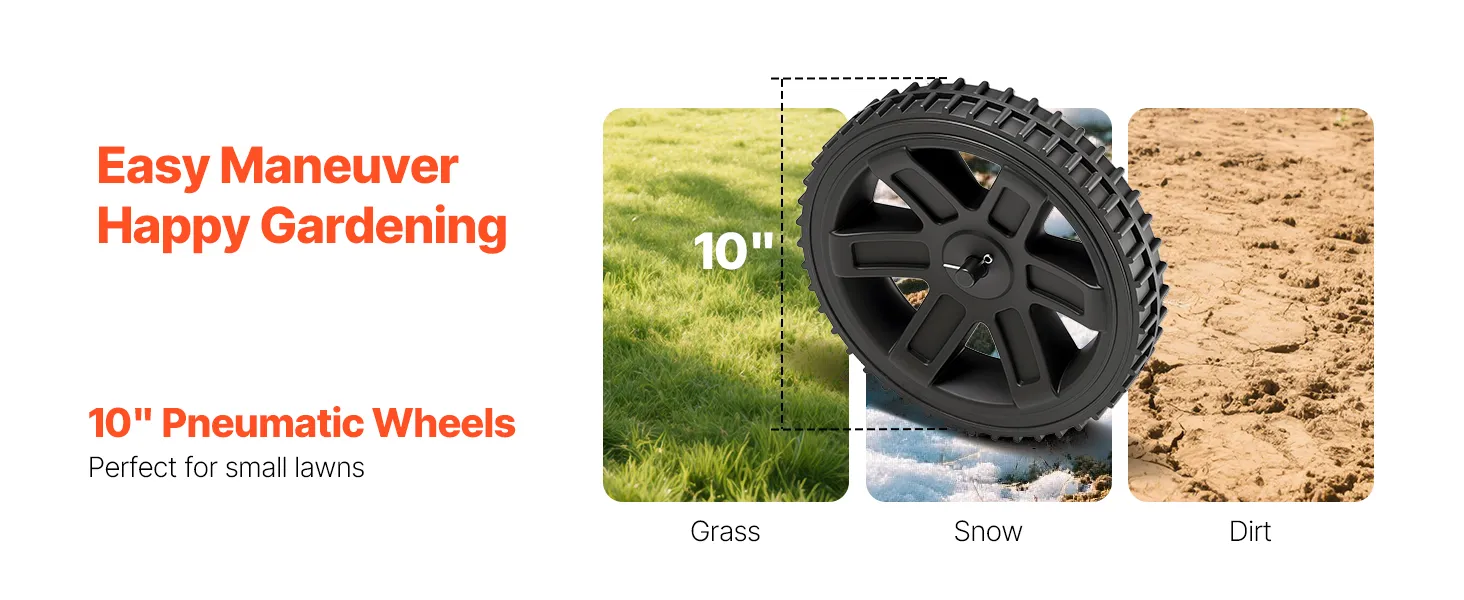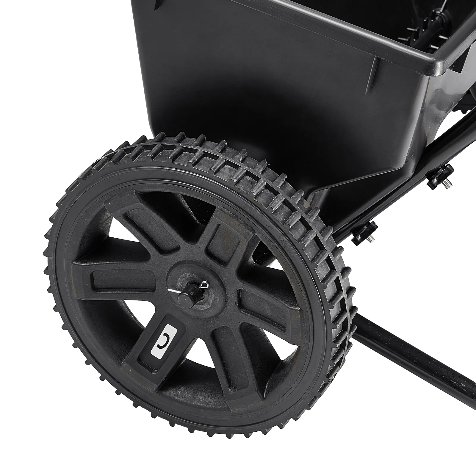 Robuste Konstruktion: Der Rasenverteiler verfügt über einen pulverbeschichteten Stahlrahmen und explosionssichere Kunststoffräder und ist beständig gegen UV-Korrosion und Stöße. Ausgestattet mit 10-Zoll (25,4 cm) Reifen eignet er sich für Gras, Schotter und schneebedecktes Gelände.