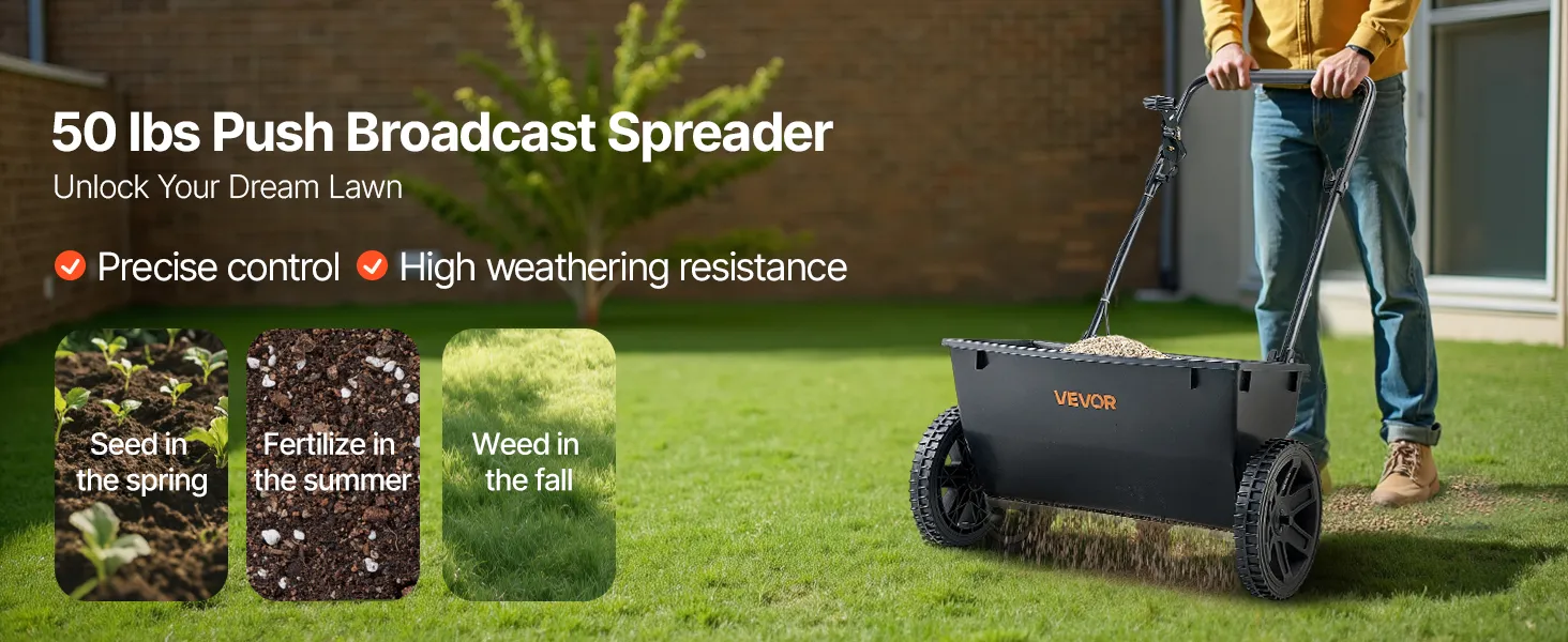 Ganzjährige Vielseitigkeit: Unser Gartenstreuer eignet sich für die Frühjahrssaat, Sommerdüngung, und Wintersalzstreuung und ersetzt vier Werkzeuge durch eines. Ideal für den privaten Rasen und kleine Bauernhöfe.