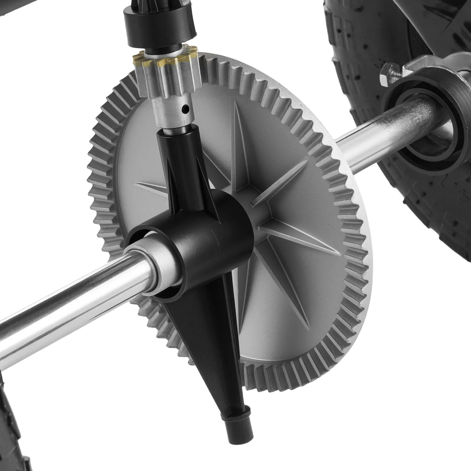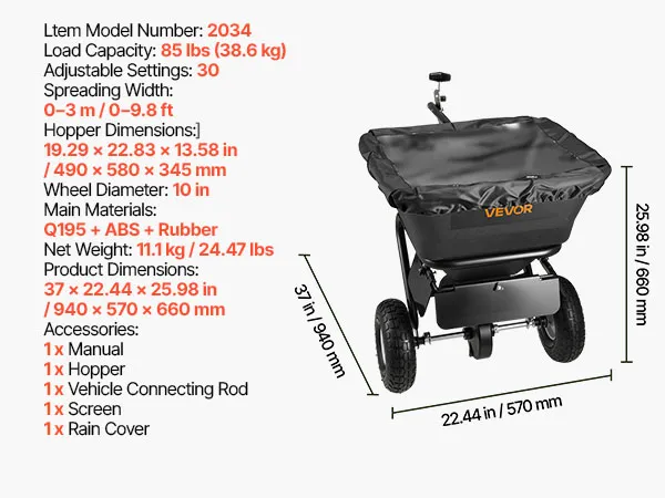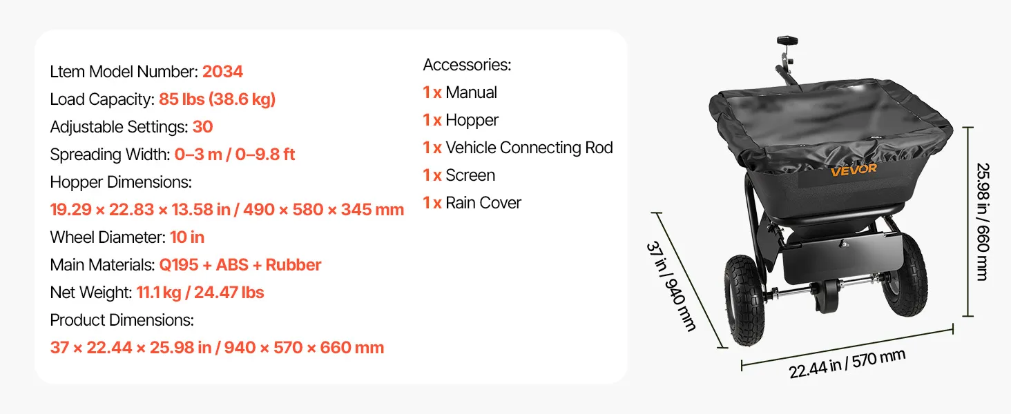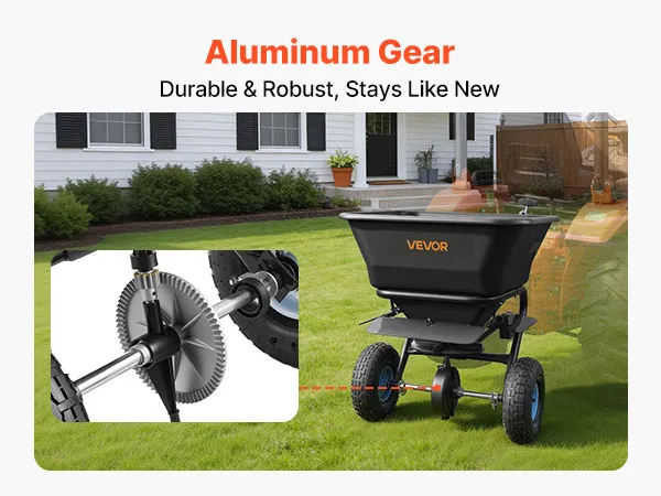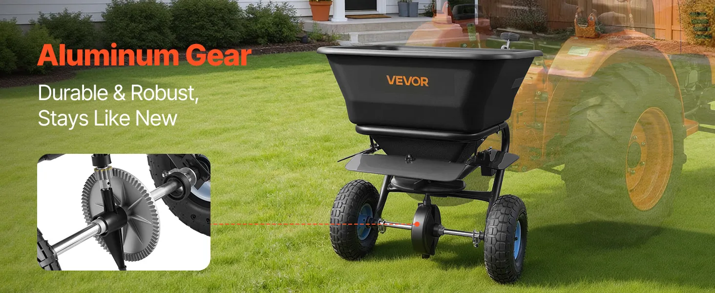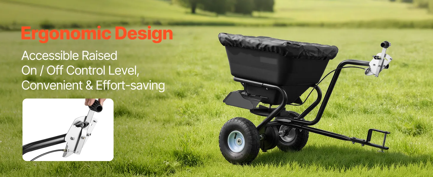 Robuste, wetterfeste Konstruktion: Der Anhängestreuer verfügt über einen pulverbeschichteten Stahlrahmen und einen UV-beständigen, stoßfesten Behälter. Ausgestattet mit 25,4 cm (10 Zoll) Luftreifen für optimale Fahreigenschaften auf Gras, Schotter und Schnee – ideal für jedes Gelände