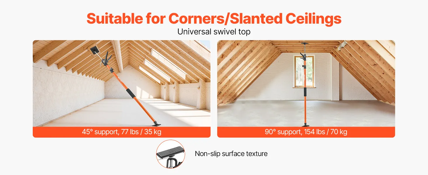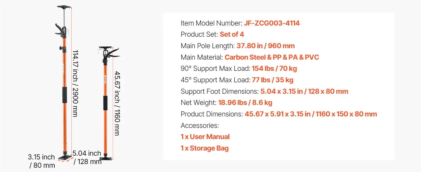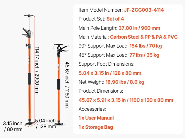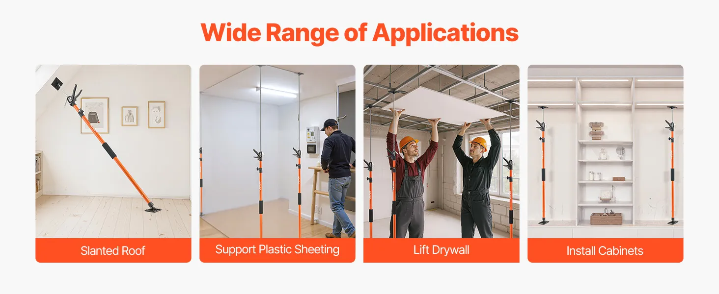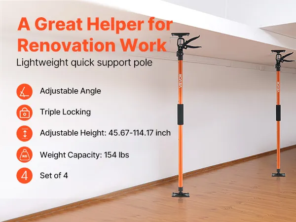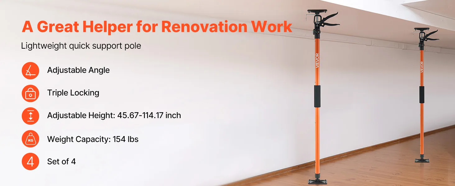 Dieses 4er-Set Deckenstütze bietet effiziente Lastunterstützung für Baustellen, Lagerhallen und Heimprojekte. Mit einer Tragfähigkeit von 70 kg, einstellbarer Höhe und sicherem Verriegelungsdesign ist es ideal zum Anheben oder Halten von Schränken, Trockenbauwänden und mehr.