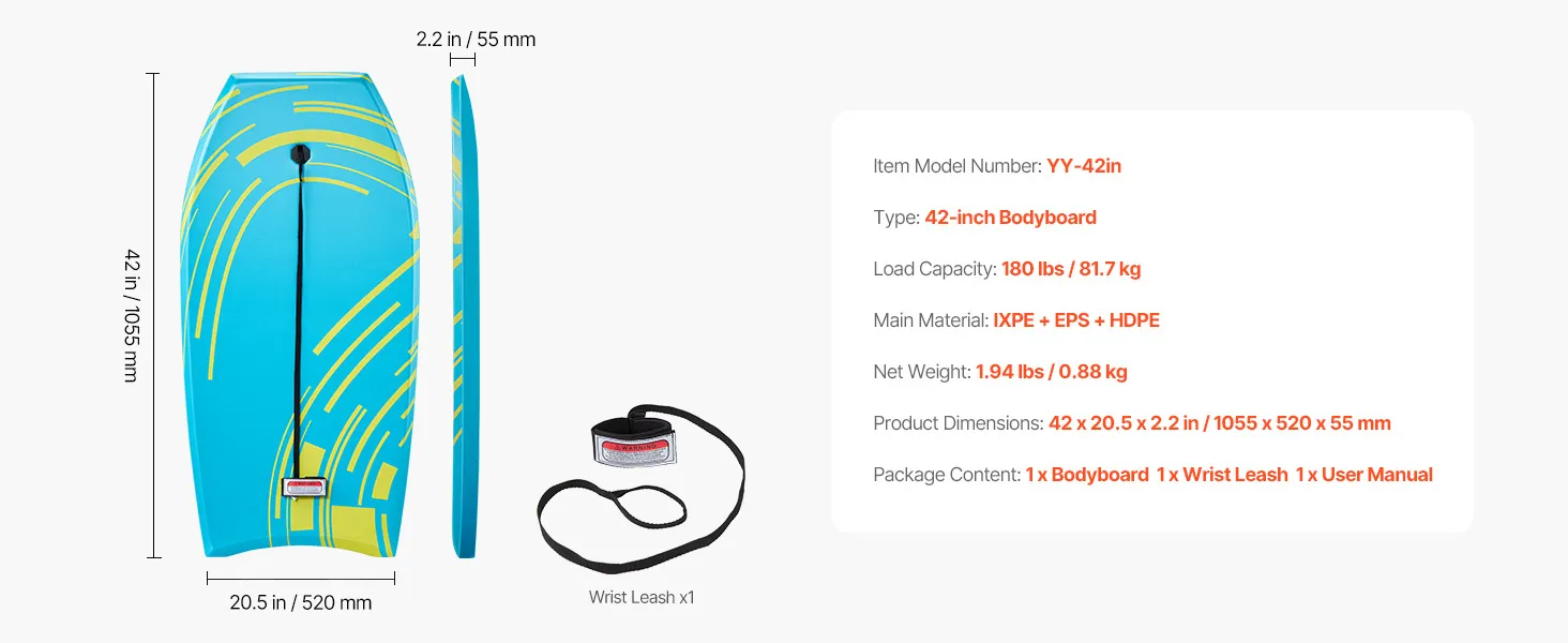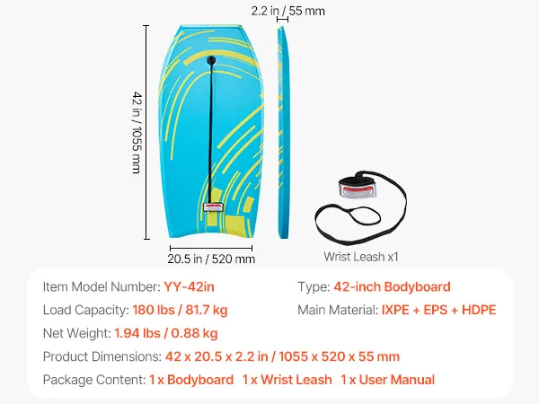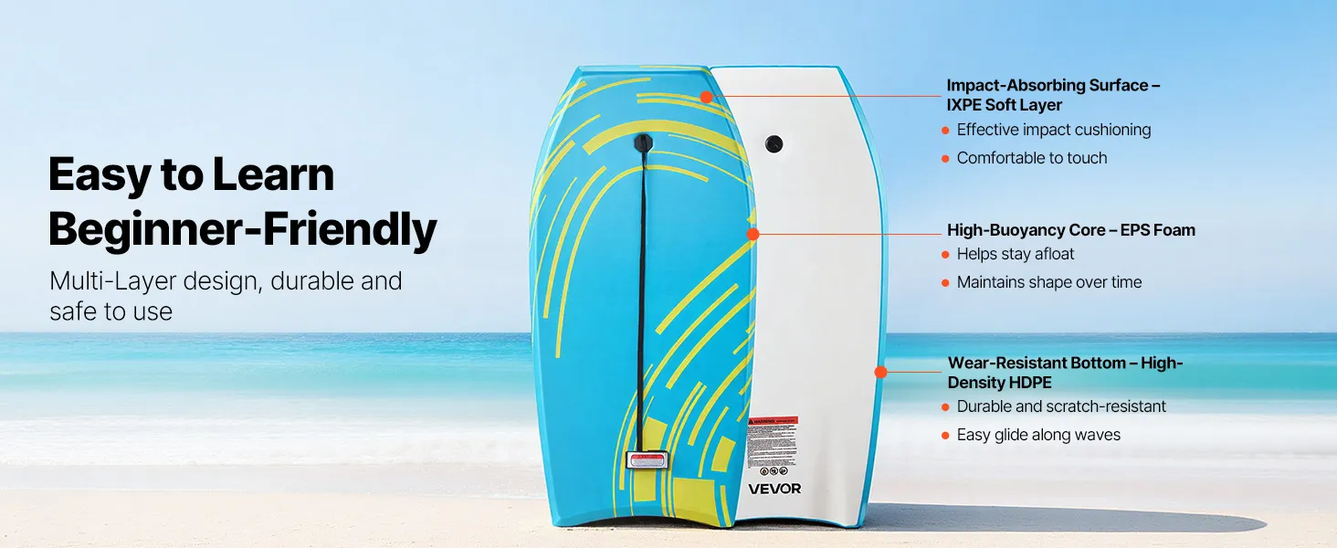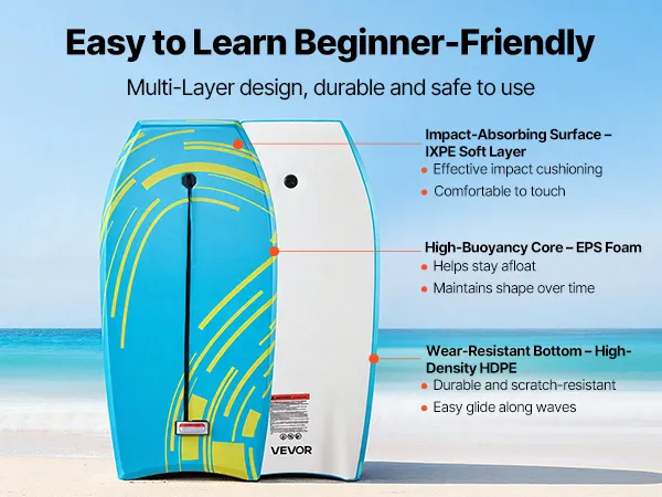 Das VEVOR 1055 mm Bodyboard ist ein einsteigerfreundliches und zuverlässiges Board fürs Wellenreiten. Mit seinem dicken EPS-Kern für starken Auftrieb, dem weichen IXPE-Deck für zusätzlichen Komfort und dem robusten HDPE-Boden für stabile Performance bietet es ein angenehmes Wellenreiterlebnis.