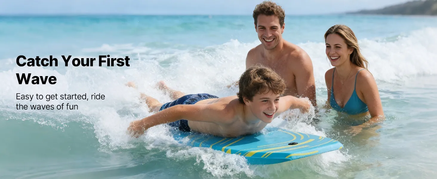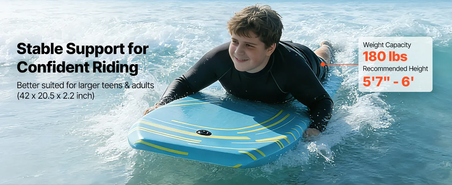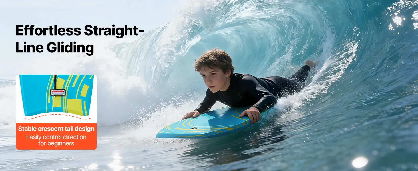 Anfängerfreundlich: Das VEVOR 1055 mm Bodyboard bietet starken Auftrieb und stabilen Halt, sodass du sanft gleiten und das Wellenreiten in vollen Zügen genießen kannst – ganz ohne Stehen. Ideal für Jugendliche und Anfänger bis 82 kg
