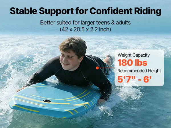Dieses Bodyboard trägt bis zu 82 kg und bietet zuverlässige Stabilität und verbesserten Auftrieb, wodurch es dem Benutzer leichter fällt, das Gleichgewicht zu halten und das Wellenreiten unbeschwert zu genießen.