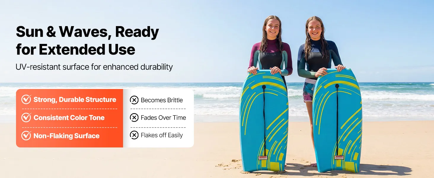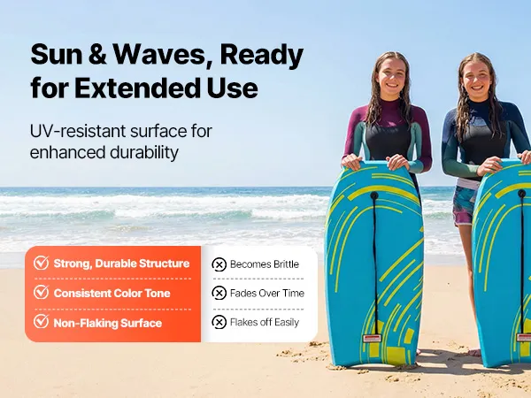 Dieses Bodyboard ist mit einer UV-beständigen Oberfläche ausgestattet, um der Sonneneinstrahlung standzuhalten, und zeichnet sich durch eine robuste Struktur, einen gleichmäßigen Farbton und eine nicht abblätternde Oberfläche für langanhaltenden Wellenreitspaß aus.