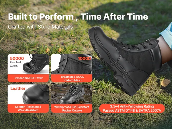 Hervorragende Traktion und Haltbarkeit: Die Gummisohle bietet Rutschfestigkeit und Wasserschutz und erfüllt die ASTM F3445-24-Norm. Die verschleißfeste Außensohle besteht die SATRA TM174- und TM92-Tests und bietet sicheren Halt auf nassen und rutschigen Oberflächen.