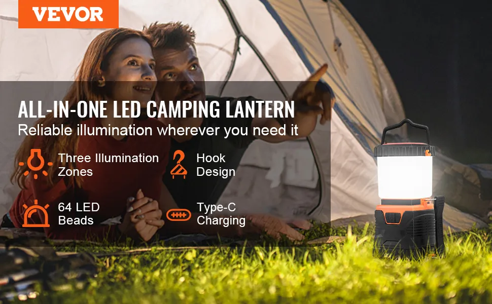 Beleuchten Sie Ihren Raum mit 64 LED-Perlen und 360°-Beleuchtung. Wählen Sie aus 2 Beleuchtungsmodi, um jeden Raum oder Außenbereich zu erhellen. Ideal, um Ihre Abenteuer angenehmer und Ihr Zuhause heller zu machen
