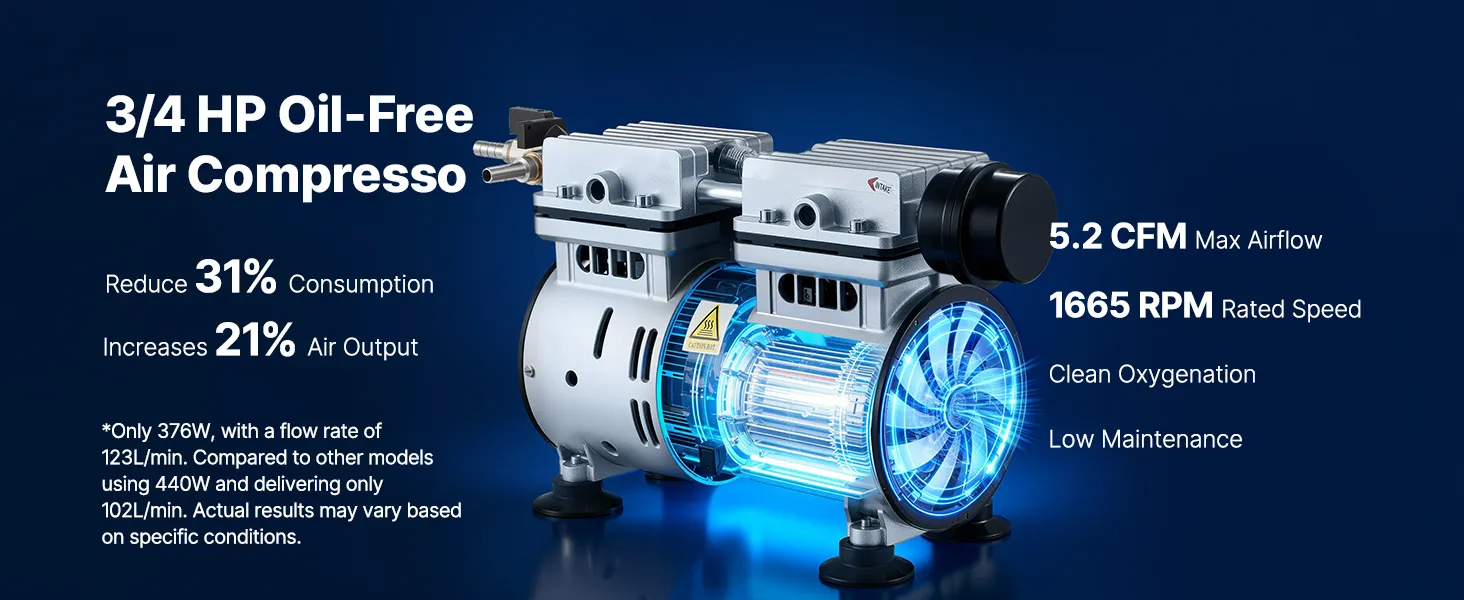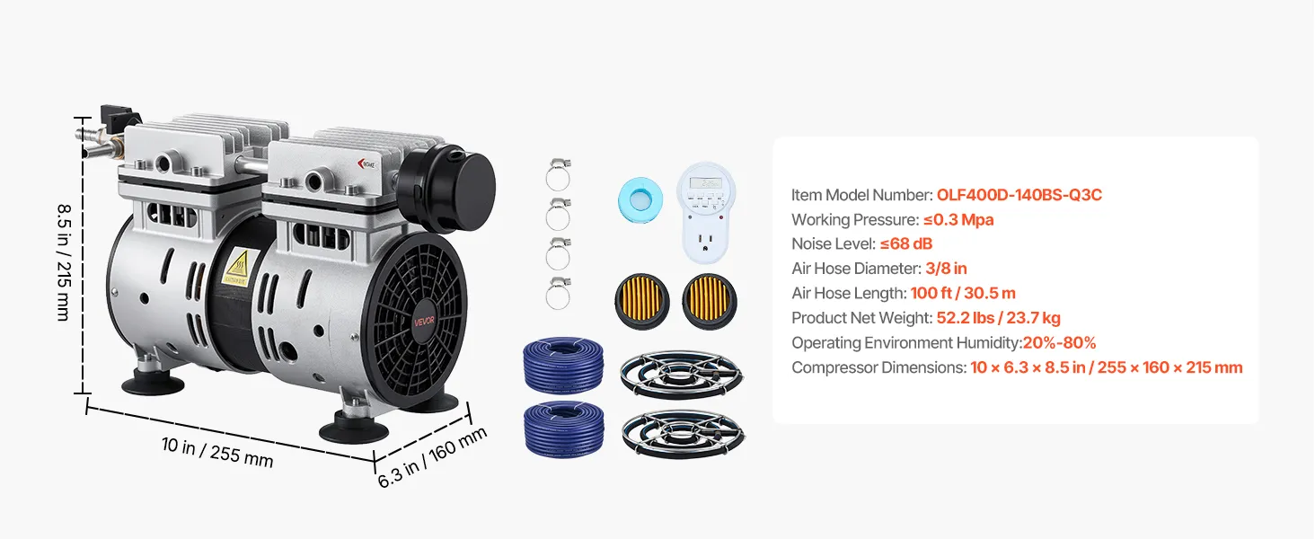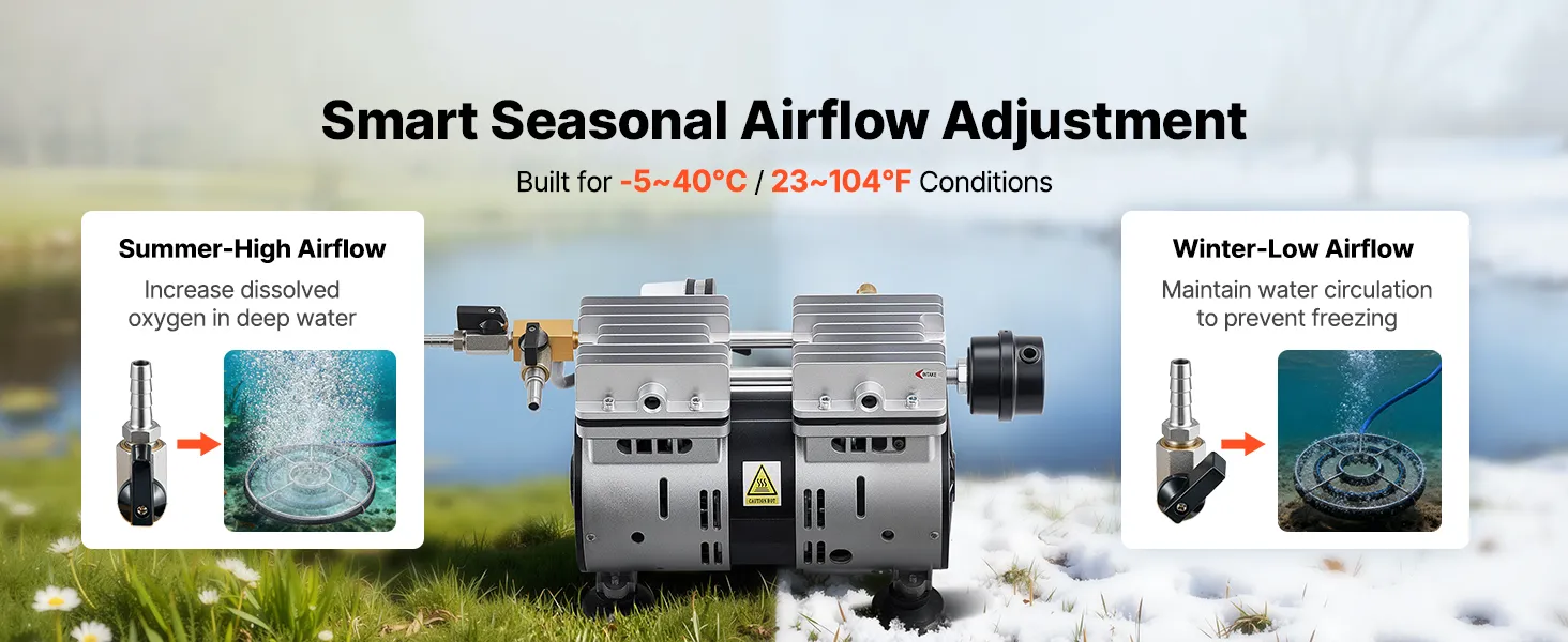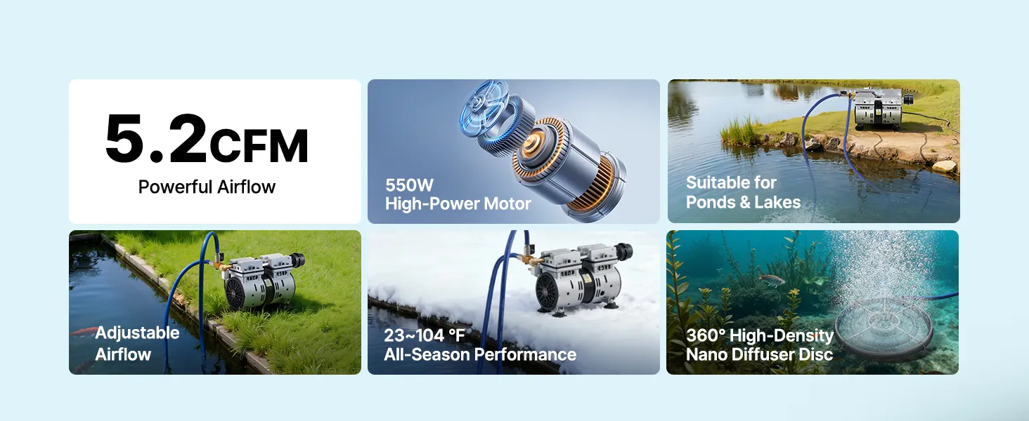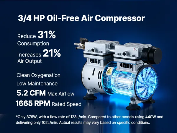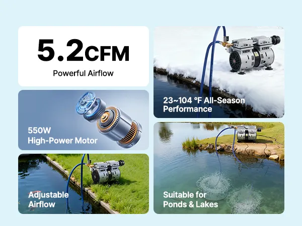 Leistungsstarker 590-W-Motor: Dieser Teichbelüfter verfügt über einen ölfreien 4/5-PS-Luftkompressor, der bis zu 5,2 CFM bei 1400 U/min liefert. Unser Teichbelüfter ist energieeffizient und wartungsarm.
