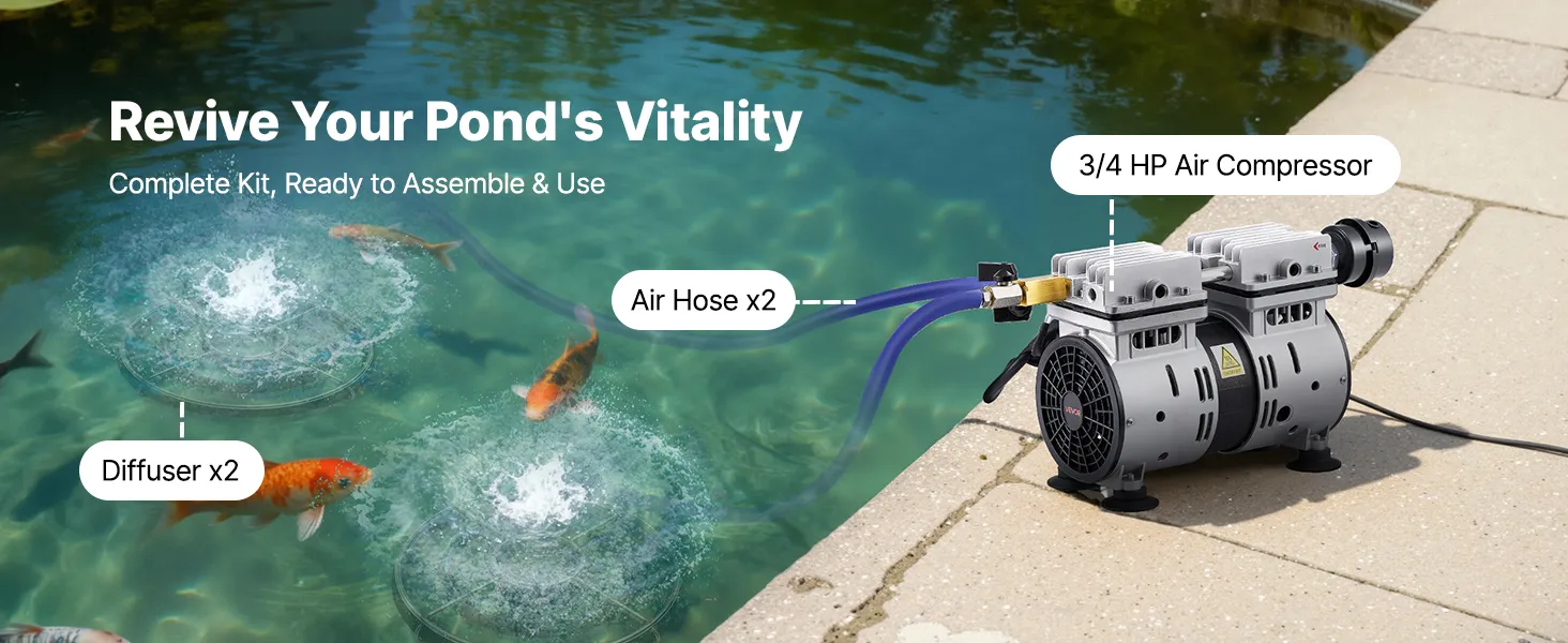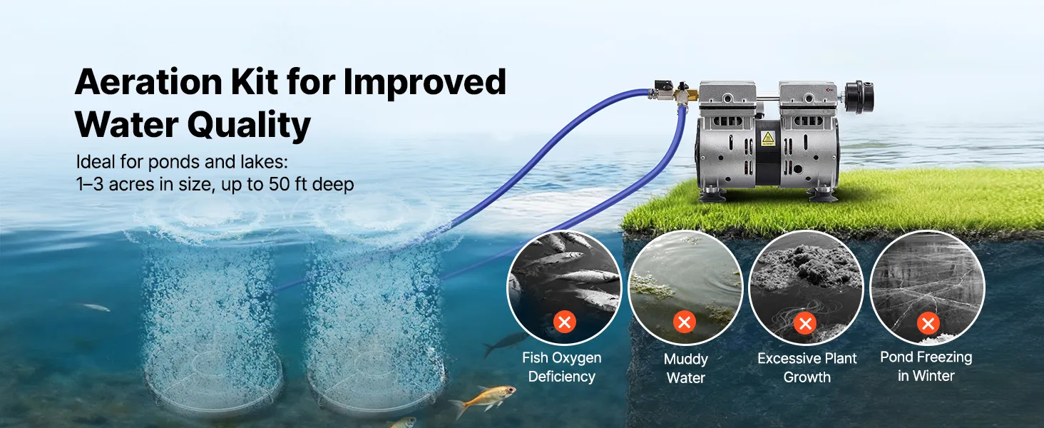 Teichbelüftungsset für 3 Hektar: Dieses Teichbelüftungsset eignet sich für Teiche von 1 bis 3 Hektar Größe und einer Tiefe von 50 Fuß. Es hilft, Fischsterben aufgrund von Sauerstoffmangel zu verhindern, reduziert das Wachstum von Wasserpflanzen und verringert die Schlammbildung.