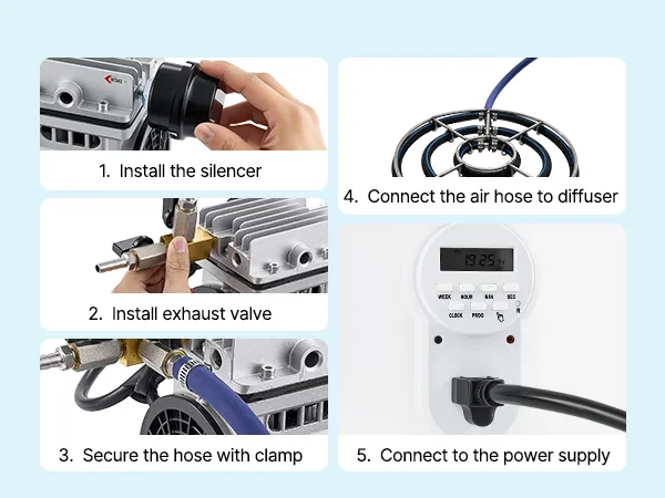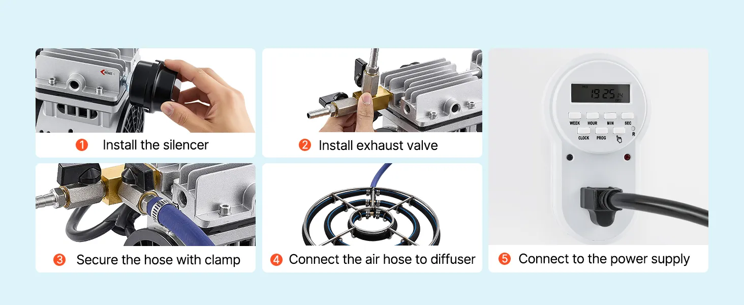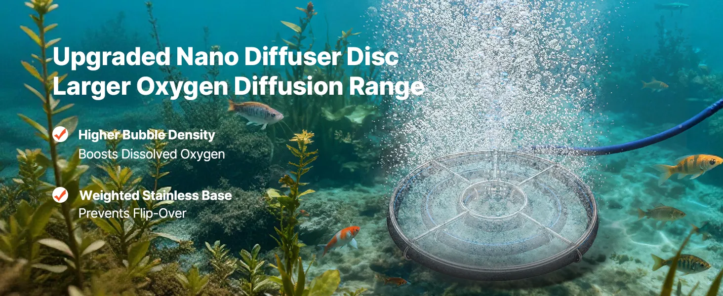 360°-Nano-Diffusorplatte: Das Teichbelüftungssystem verfügt über zwei optimierte Nanoblasen-Diffusoren, die dichte, feine Blasen freisetzen und so den Sauerstoffgehalt erhöhen. Der 360°-Luftstrom sorgt für eine optimale Wasserzirkulation.