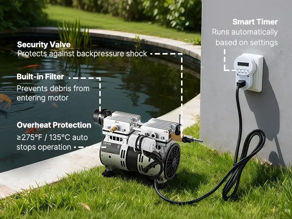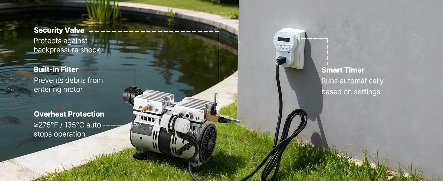 Mehrfacher Sicherheitsschutz: Der Teichbelüfter für den Außenbereich ist mit einem Überhitzungsschutz und einem Rückflussverhinderungsventil für den Langzeitbetrieb ausgestattet.
