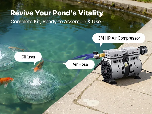 Dieses gebrauchsfertige Teichbelüftungsset eignet sich für Teiche bis zu einer Größe von 1–3 Hektar und einer Tiefe von 15 Metern. Es lässt sich schnell installieren und erhöht den Sauerstoffgehalt, verbessert die Wasserqualität und reduziert Algenwachstum und Schlammbildung.
