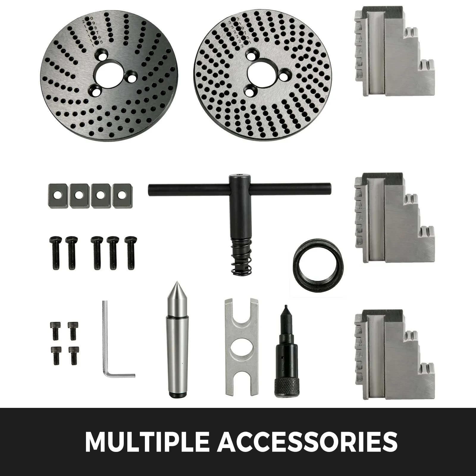 3 Teilungsplatten für verschiedene Größen mit einfacher Indexierung der Teilungen von 2 bis 50 und der meisten Zahlen bis 380. Eine Reihe von Werkzeugen bietet zusätzliche Hilfe.
