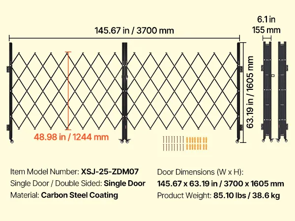 Einziehbares Falttor: Das Falttor verfügt über eine einziehbare Breitenkonstruktion. Maximale Größe ausgeklappt: 145,67 x 63,19 Zoll / 3700 x 1605 mm (B x H). Minimale Breite zusammengeklappt: 6,1 Zoll (15,49 cm). Diese Standardgröße eignet sich für Sicherheitstüren, Schutzbarrikaden und Verteidigungsanlagen