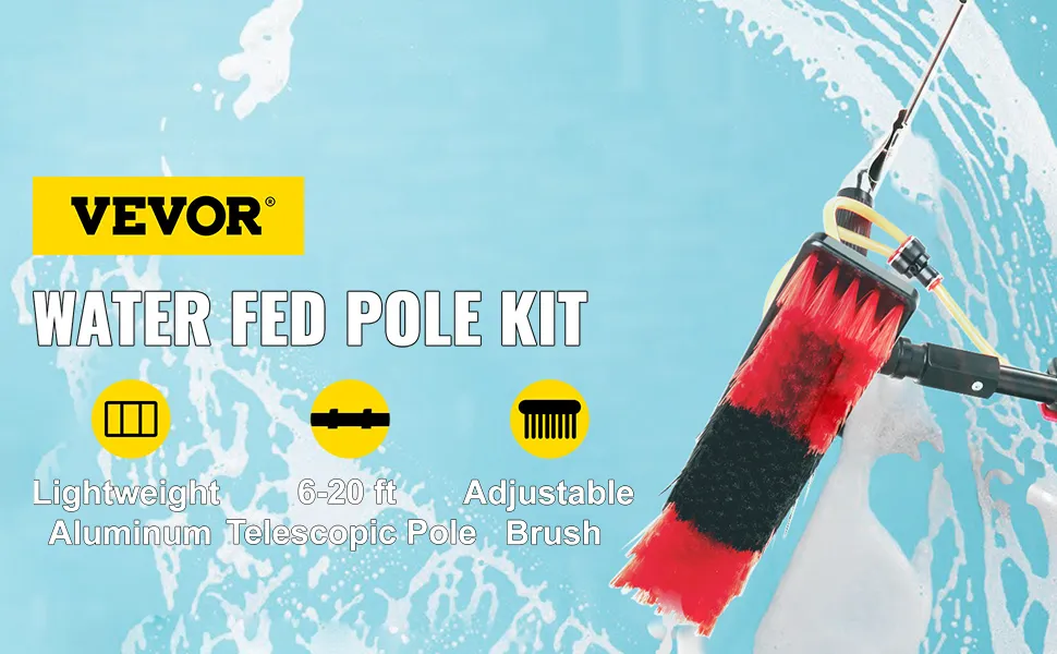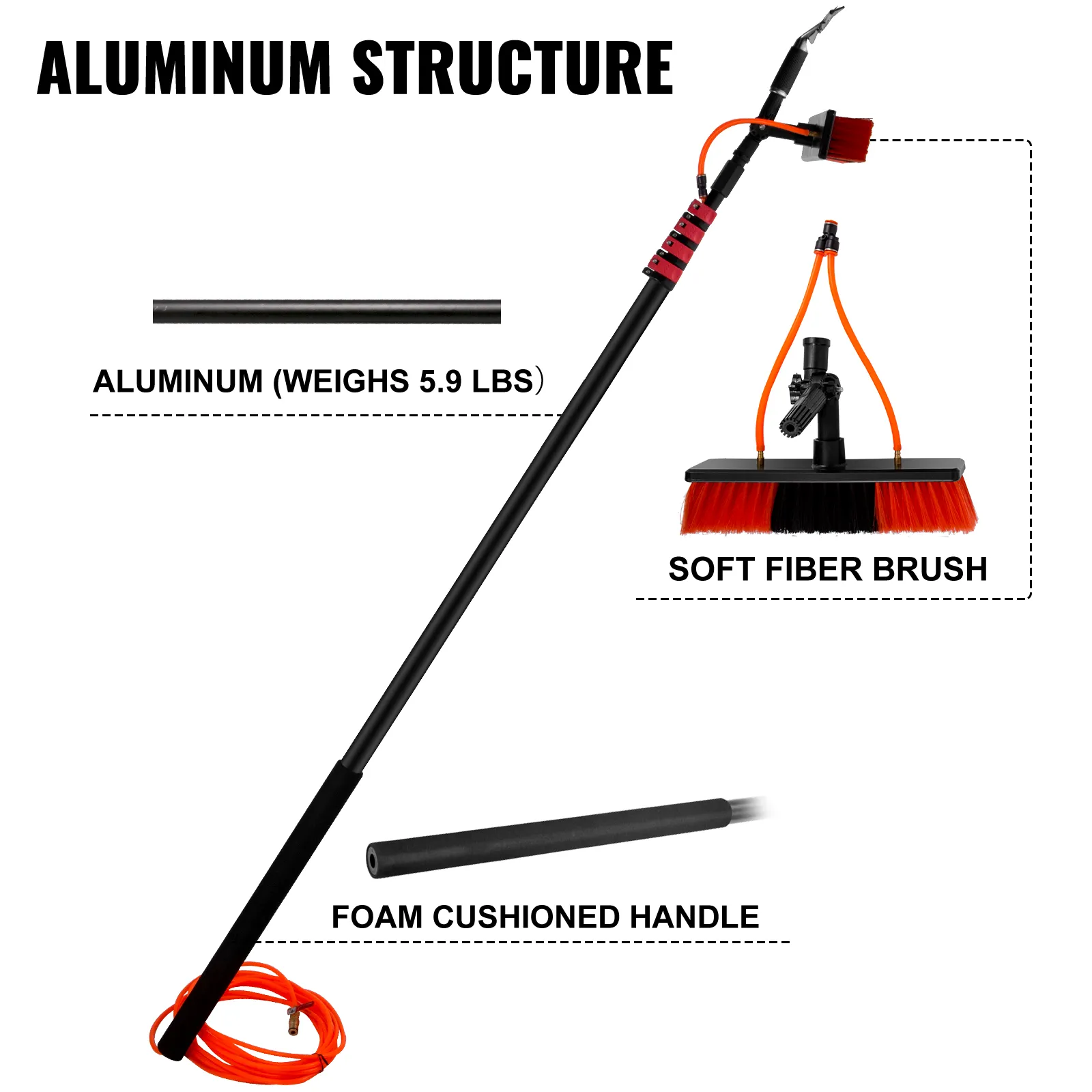 Unsere Teleskopstange Wasserführende Waschbürste verfügt über eine Länge von 1,8 bis 6 m / 6 bis 20 Fuß, einen ca. 7 m / 23 Fuß langen Schlauch mit Messinganschluss und flexiblem Bürstenkopf, mit dem hohe Fenster und Sonnenkollektoren gereinigt und gewaschen werden können. Wenn Sie nach einer praktischen Lösung für die Reinigung von Haus und Garten suchen, ist unsere wassergefütterte Bürste die richtige Wahl!