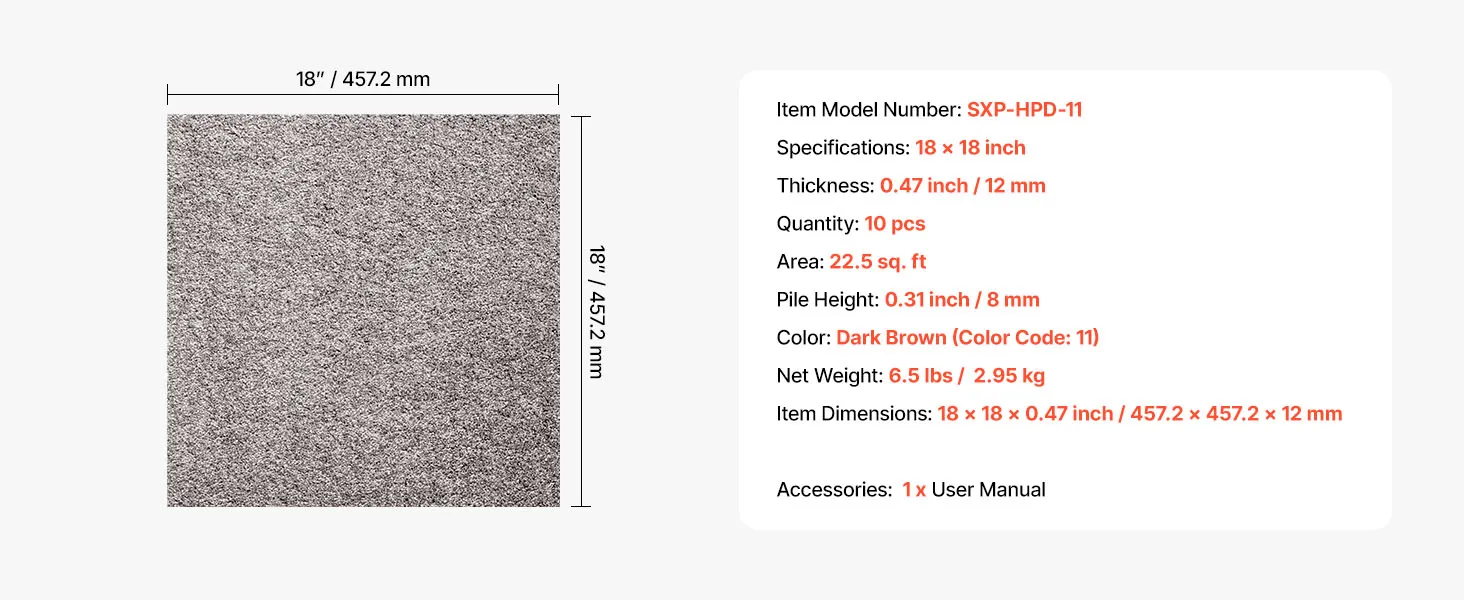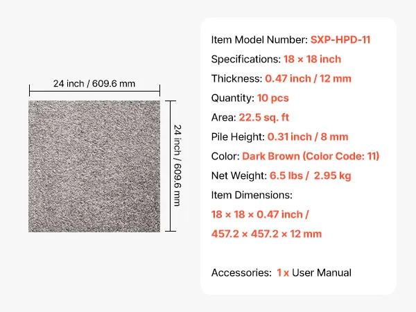 VEVOR Teppichfliesen 457,2 x 457,2 x 12 mm, 10er-Pack, selbstklebender Teppichboden mit Fläche von 2 m², Teppich Bodenbelag, einfacher DIY-Austausch für Wohnzimmer und Büro, Dunkelbraun