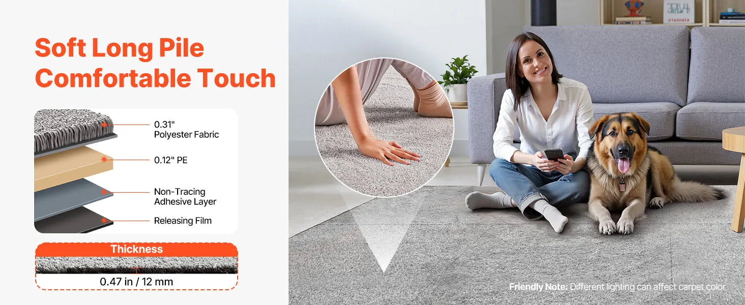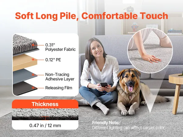 Weich und komfortabel: Jede selbstklebende Teppichfliese ist mehrschichtig aufgebaut. Die 0,89 cm dicke Plüschoberfläche gepaart mit einer 0,30 cm dicken, hochdichten Memory-Schaum-Unterlage sorgt für ein weiches, gepolstertes Gefühl unter den Füßen.