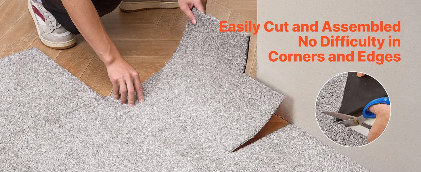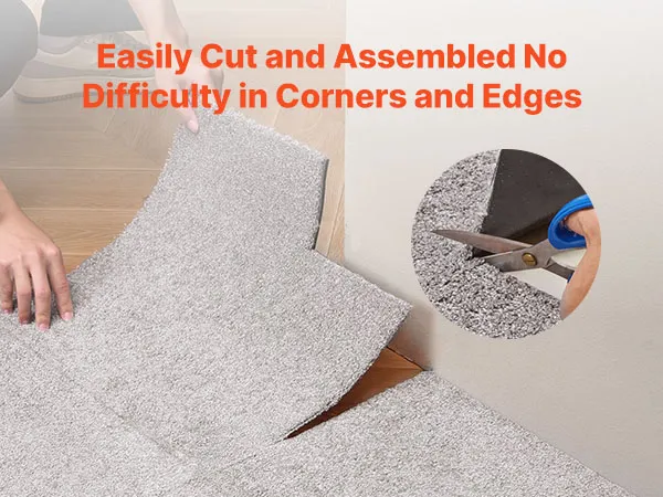 Jede Teppichfliese kann frei auf jede beliebige Form und Größe zugeschnitten werden, sodass sich unregelmäßige Bereiche problemlos abdecken und der gesamte Raum problemlos abgedeckt werden kann.