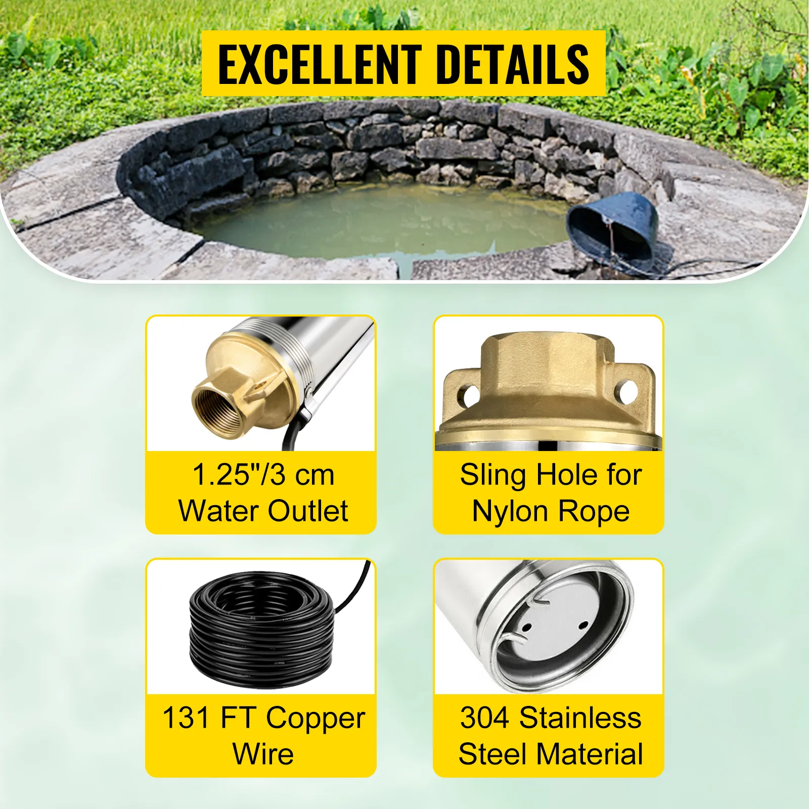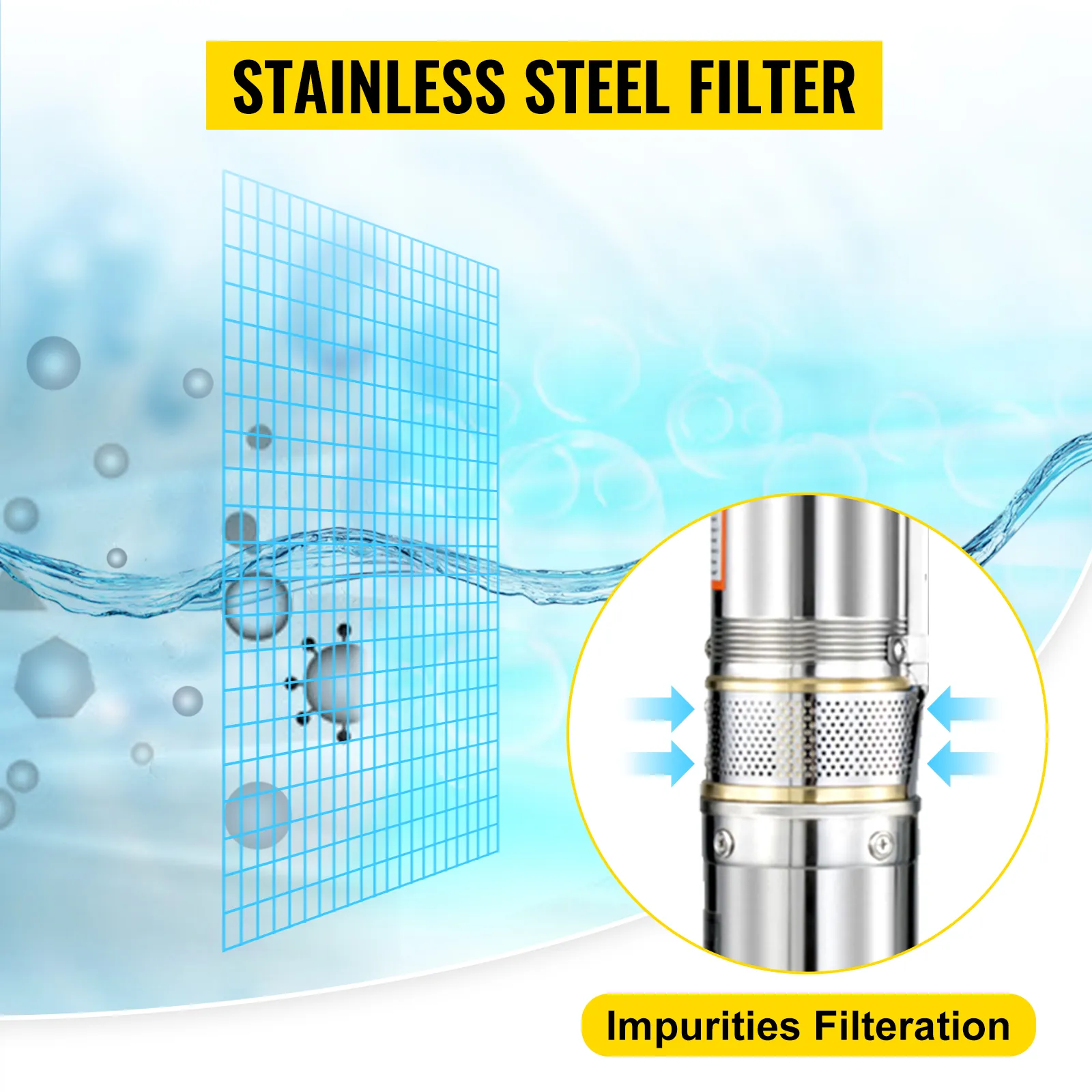 • Ausgezeichnetes Filtersieb: Das Filtersieb der Tauchpumpe ist aus Edelstahl gefertigt, um Verunreinigungen zu filtern. Bei einem neu gebohrten Brunnen mit übermäßigen körnigen Ablagerungen können Sie eine Lage Gaze vor dem Filtereinlass hinzufügen.