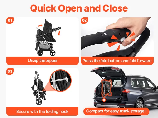 Schnelles Zusammenklappen mit einer Hand: Der Hundebuggy lässt sich mühelos mit einer Hand zusammenklappen und platzsparend verstauen. Er passt problemlos in den Kofferraum Ihres Autos oder in kleine Räume zu Hause und eignet sich für Reisen, Ausflüge oder den täglichen Gebrauch.