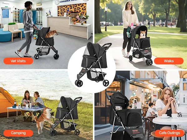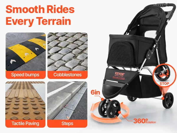 Reibungslose und stabile Mobilität: Dieser faltbare Haustierbuggy verfügt über 6-Zoll-EVA-Schaumräder zur Stoßdämpfung und bietet Vielseitigkeit auf Gras, Gehwegen und Sand. Ein um 360° drehbares Vorderrad sorgt für einfache Navigation, während die Hinterradbremsen beim Anhalten für Sicherheit sorgen.