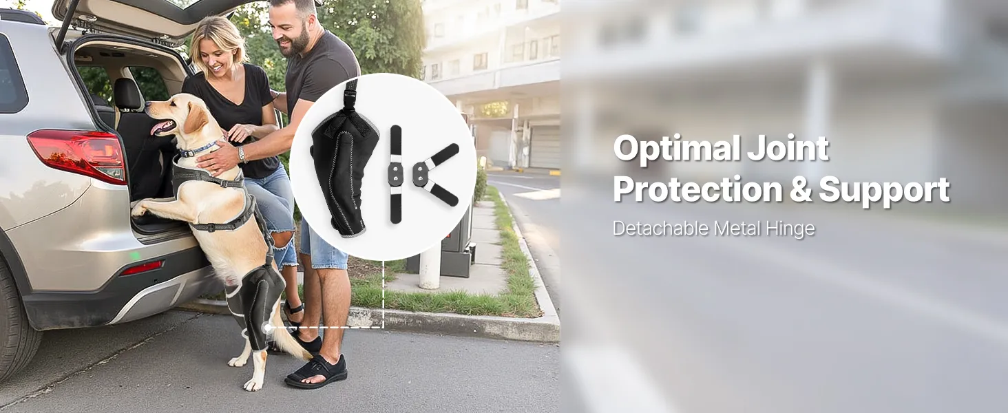 Flexibles Scharnierdesign: Die Hundeknieorthese für gerissene Hinterbeine verfügt über abnehmbare Metallscharniere, die sich an Veränderungen der Form des Hundebeins während der Bewegung anpassen und so flexiblen Halt bieten und die Genesung während der Bewegungen Ihres Hundes unterstützen.