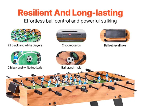 Robust und langlebig: Der 42-Zoll-Tischkicker besteht aus mitteldichter Faserplatte, ist langlebig und schimmelresistent. Er bietet Platz für 22 Spieler und 2 Fußbälle. Die Stangen sind gerade und glatt und gewährleisten kraftvolle Schläge, ohne sich zu verbiegen oder zu rosten