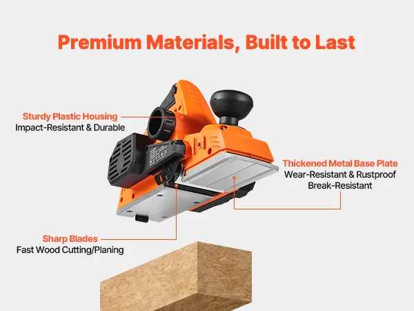 With a powerful motor, our corded electric handheld planer delivers strong performance. The sturdy plastic housing is impact-resistant, while the reinforced metal base plate withstands wear and rust. Sharp blades provide fast cutting and smooth planing, extending service life.