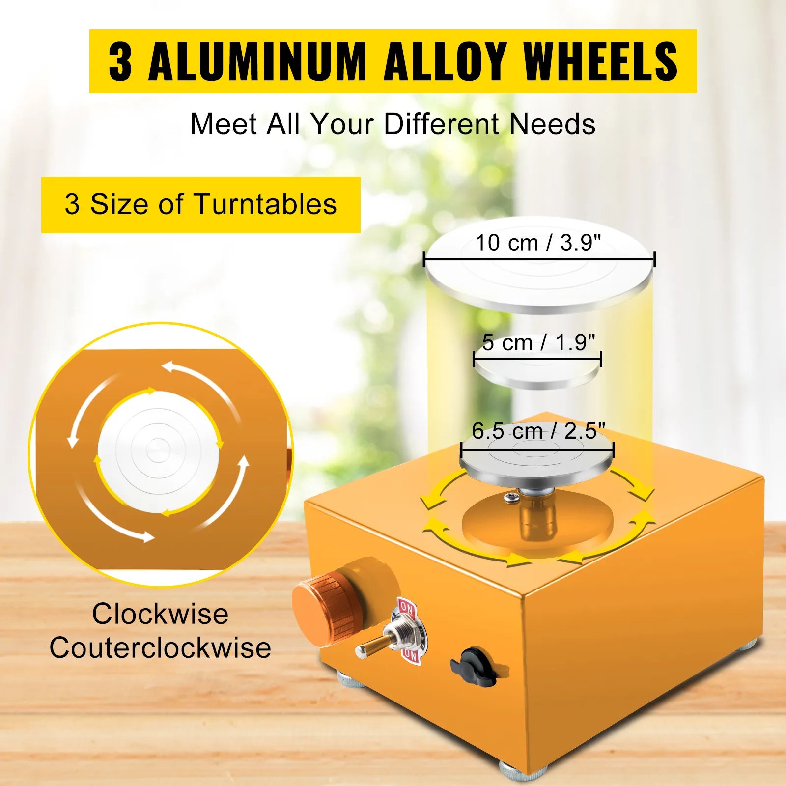 Diese Mini-Keramikmaschine bietet 3-Größen-Plattenspieler aus Aluminiumlegierung, die zur einfachen Reinigung abnehmbar sind und nicht rosten, sodass Benutzer verschiedene Kunstwerke effizient ausführen können. Die Vorwärts- und Rückwärtsdrehung kann den unterschiedlichen Gewohnheiten der Benutzer gerecht werden.