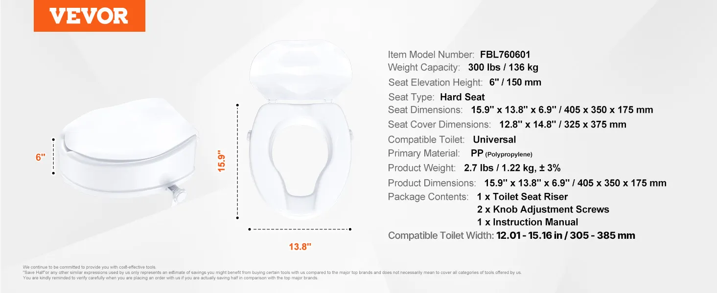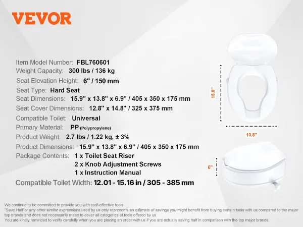 6-inch toilet riser: This toilet riser raises the toilet seat by 6 inches (150 mm), providing a comfortable toileting option for pregnant women, the elderly, and injured individuals, relieving joint strain and catering to the needs of the whole family.